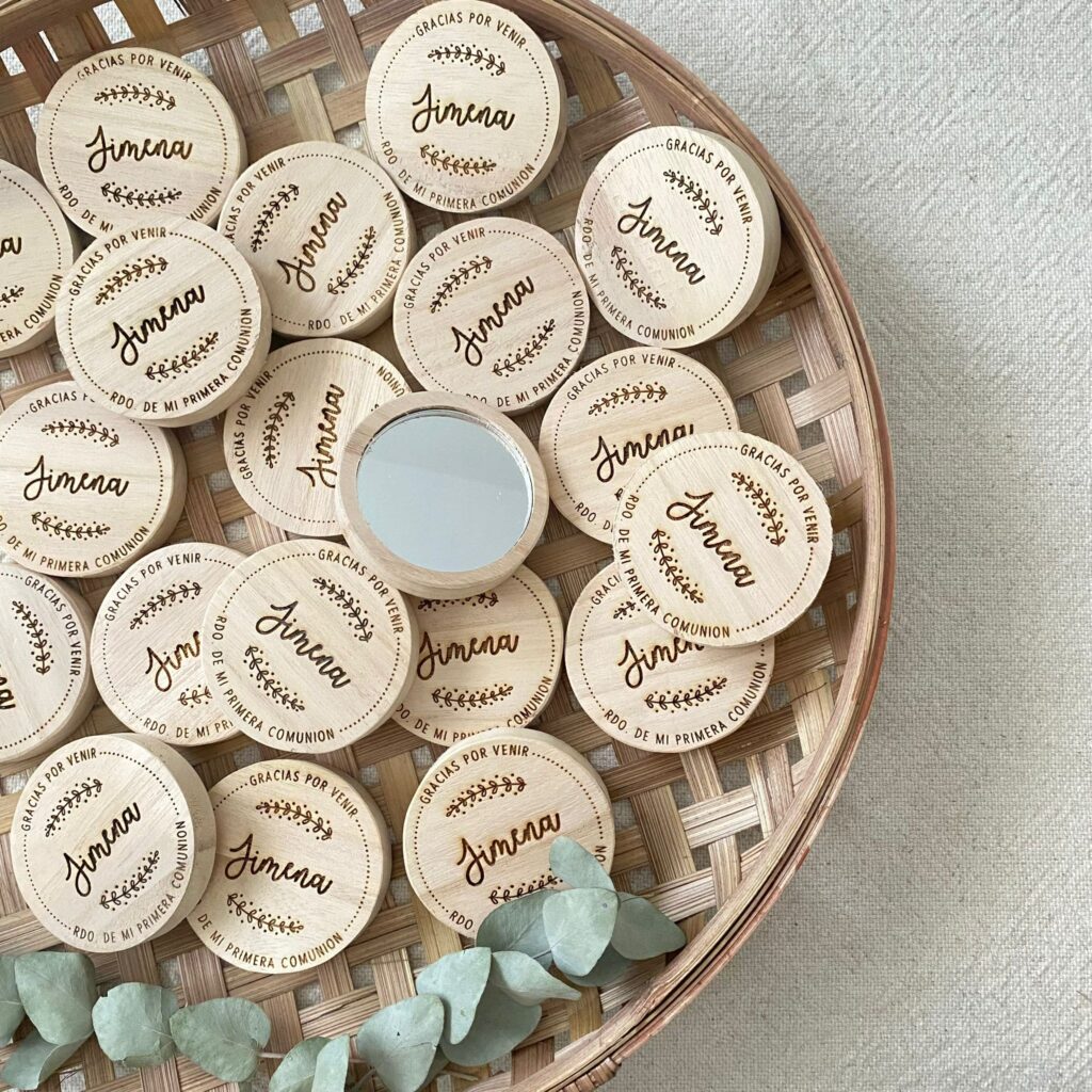 Los recuerdos personalizados siguen siendo una opción muy popular porque son pequeños, elegantes y fáciles de guardar. Algunos de los más habituales son imanes personalizados, chapas, puntos de lectura o espejitos de bolso. Son detalles sencillos, pero muy bonitos, que permiten llevarse un recuerdo de la comunión sin que resulte algo excesivo.