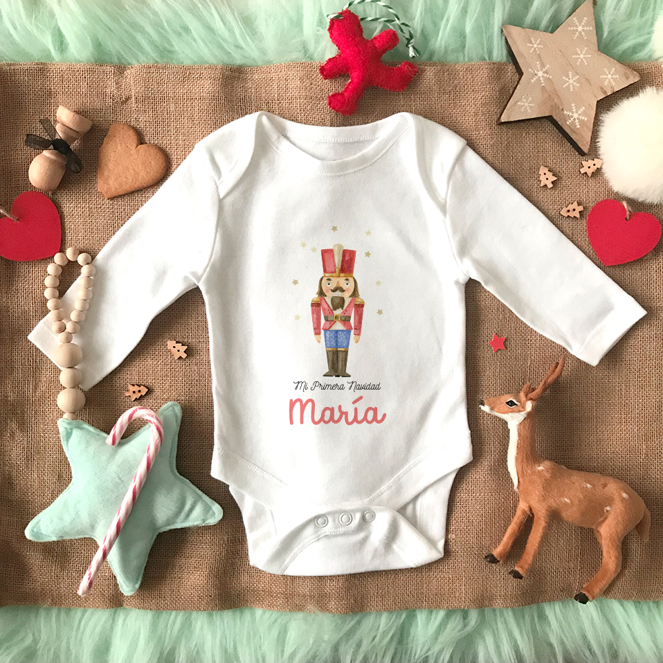 Las Navidad es una época mágica y si son las primeras mucho más, por ello hemos creado este bonito body navideño con este simpático Cascanueces que podrás personalizar con su nombre para que no le falte detalle en una fecha tan especial.