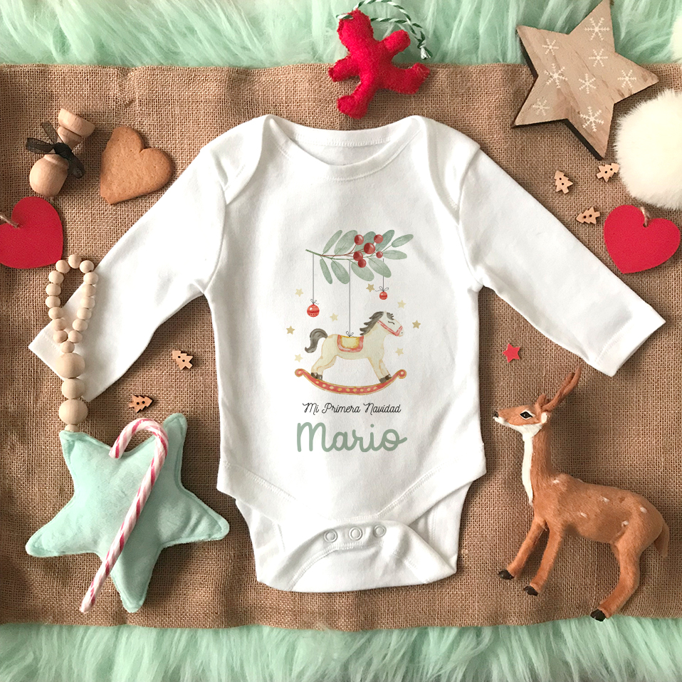 Las Navidad es una época mágica y si son las primeras mucho más, por ello hemos creado este bonito body navideño con este precioso caballito que podrás personalizar con su nombre para que no le falte detalle en una fecha tan especial.